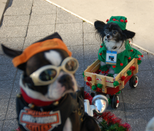 For this year’s Gaslamp parade, Chopper went all out and “accessorized” his Harley with Christmas decorations. But he didn’t stop there. He dressed as “Santa” and towed a little red wagon behind his Harley. And in that wagon sat his buddy “Spike” dressed as an elf. Together, Chopper and Spike took “Best of Show” in a parade San Diego (Chopper) won’t soon forget! (see photos below)
