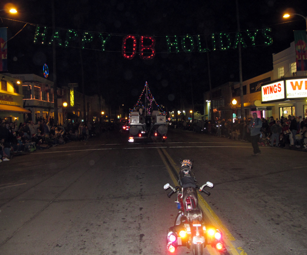 The following week-end (December 11th), Chopper participated in the 3rd Annual San Diego Gaslamp Parade. This is an event that has special meaning for both Mark and Chopper, for it was Chopper’s predecessor, “Bandit The Biker Dog” who had been announced as the Grand Marshal in the inaugural running of the parade in 2008. Sadly, Bandit fell seriously ill shortly before the event and had to pull out. Several weeks later, Bandit tragically passed away.